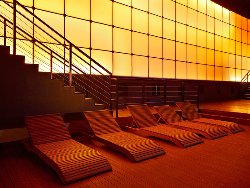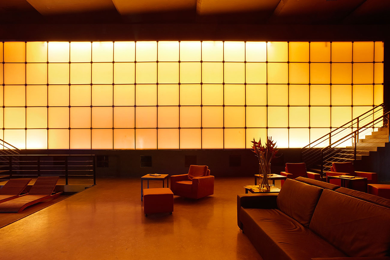 Ao fundo, o painel de azulejos de Alexandre Mancini pode ser visto nos dois andares. No superior, onde está o bar e no inferior onde está o SPA, proporcionando uma leitura única.