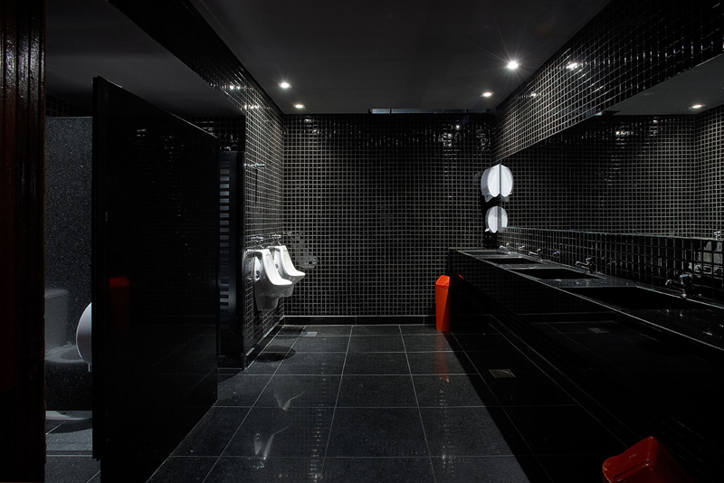 As áreas de chuveiros e escaninhos são inteiramente vermelhas e os banheiros pretos.